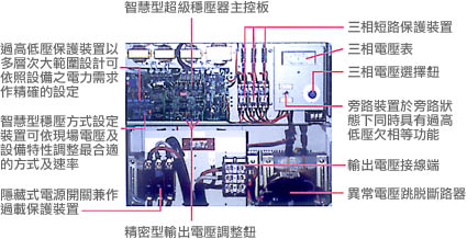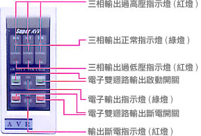 穩壓器屬於電源設備之一,一般使用者不太注意電錶所指示的電壓值是否在所需要之規格內,此智慧型超級穩壓器的設計使用者只需由面板燈號顏色,很容易瞭解穩壓器之狀況,全部是綠燈代表機器正狀態,若有任何紅燈即代表有異常現象。
